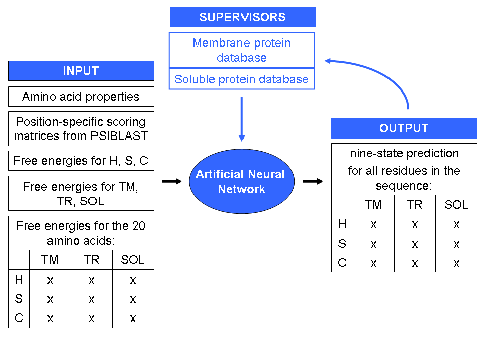 An Artificial Neural Network (ANN) will be trained on non-redundant datasets of both soluble and membrane proteins (sequence similarity <25%) to accomplish this task (Fig. 1). As input serve several amino acid properties, position-specific scoring matrices from PSIBLAST, and knowledge-based free energies for the secondary structure types helix, strand, or coil and the regions trans-membrane, interface, or solution. A matrix of these numbers over a window of 31 amino acids forms the input for the ANN. The output is a nine-state prediction for the central residue in the sequence window.