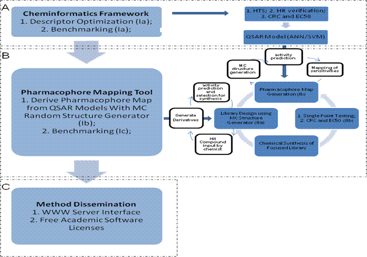 Figure 1: Overall research strategy where cheminformatics method development informs drug discovery. Depicted are the use of a cheminformatics framework for the identification of hit compounds with novel chemotypes, and the implementation of a pharmacophore mapping tool for the design of focused libraries during hit-to-lead optimization of mGluR5 PAM. (A) Cheminformatics framework for vHTS using QSAR models implemented in the mentor's lab1. (B) Implementation of a pharmacophore mapping tool and its application in the design of focused libraries during hit-to-lead optimization of mGluR5 PAMs. (C) Method Dissemination strategy.