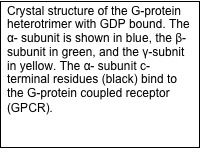 Rhodopsin is a G-protein-coupled receptor (GPCR), which are integral membrane proteins with seven transmembrane helices. When activated by an extracellular affecter, GPCRs bind to G-proteins, catalyzing the release of GDP from the G-protein. The alpha subunit of the heterotrimeric G-protein (Galpha) can then interact with intracellular partners and propagate the signal into the cell. The protein arrestin binds to GPCRs in order to regulate their activity.